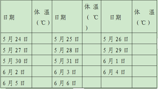 備注:1.考生應按上表每日測量體溫、進行健康監測,如出現發熱、干咳、流涕等可疑癥狀應及時就醫。2.入場攜帶本承諾書、核酸檢測證明連同彩打的云南健康碼、通信大數據行程卡交考點、考場查驗。3.考生對所填內容真實性負責。